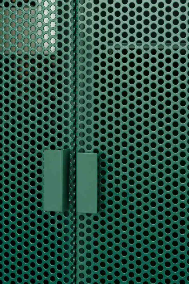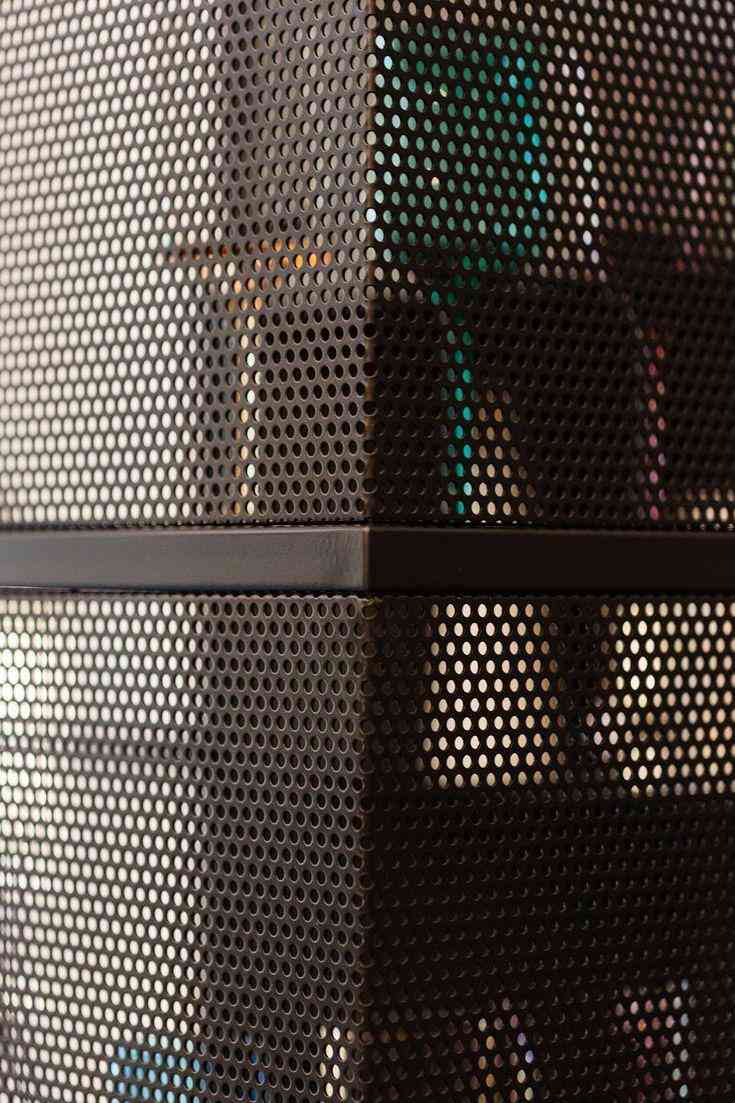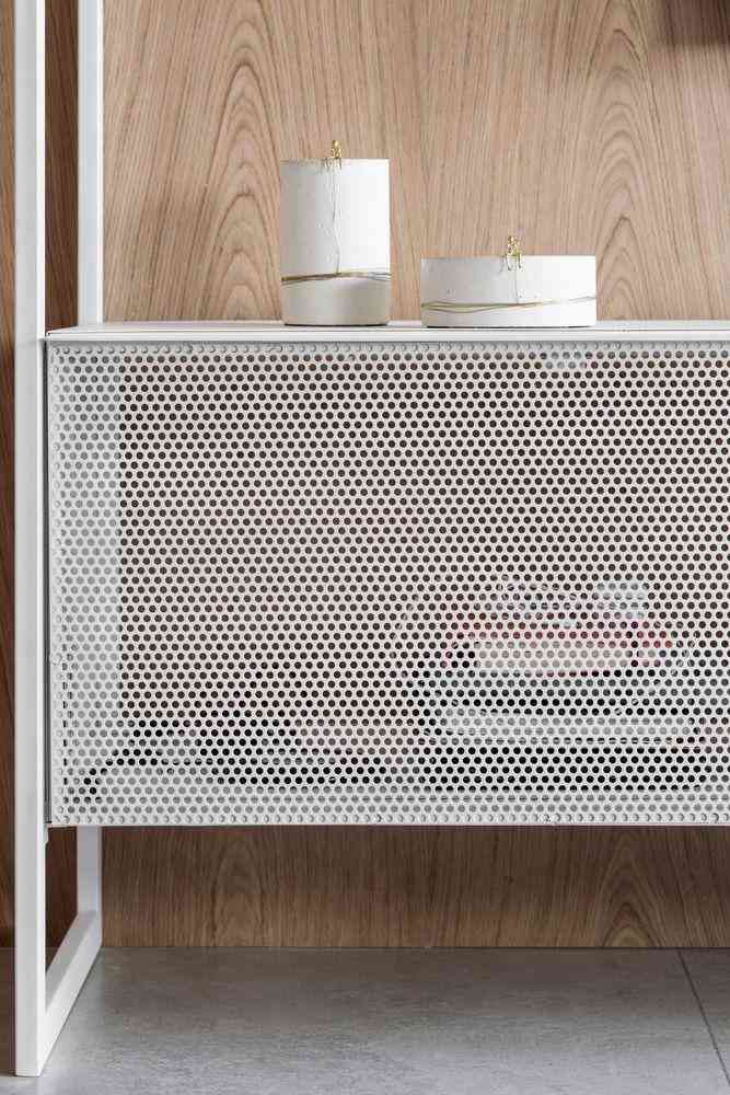 Nuestros estantes incorporan mallas perforadas especializadas con diversos patrones: circulares, hexagonales y rejillas expandidas. Disponibles en acabados verde esmeralda, blanco, negro y acero natural, todos tratados con pintura electrostática. Estos materiales perforados aportan funcionalidad, reducen peso y crean efectos lumínicos únicos que transforman cada estante en una pieza escultural contemporánea.